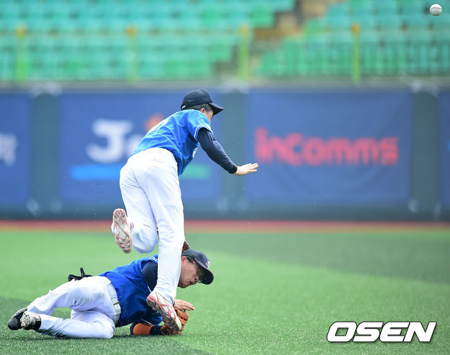 23일 전라북도 군산시 사정동 월명야구장에서 열린 제1회 KBO총재배 시도대항 전국 직장인 야구대회 4강전 부산 세종공업과 경남 삼성테크윈 경기, 3회초 1사 주자 1루 세종공업 김태균의 안타때 삼성테크윈 2루수 지진호와 우익수 김보찬이 충돌하고 있다.