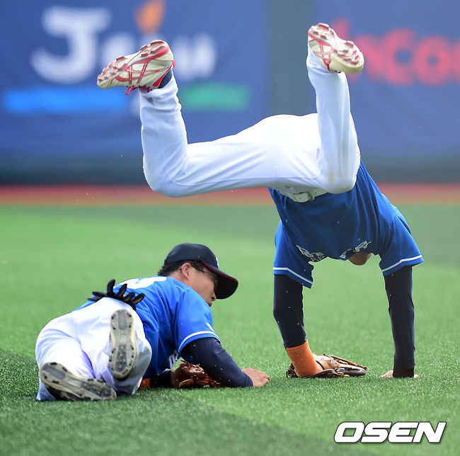 23일 전라북도 군산시 사정동 월명야구장에서 열린 제1회 KBO총재배 시도대항 전국 직장인 야구대회 4강전 부산 세종공업과 경남 삼성테크윈 경기, 3회초 1사 주자 1루 세종공업 김태균의 안타때 삼성테크윈 2루수 지진호와 우익수 김보찬이 충돌하고 있다.
