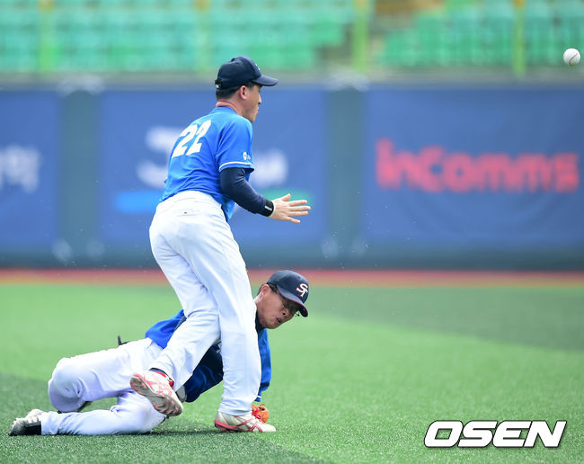 23일 전라북도 군산시 사정동 월명야구장에서 열린 제1회 KBO총재배 시도대항 전국 직장인 야구대회 4강전 부산 세종공업과 경남 삼성테크윈 경기, 3회초 1사 주자 1루 세종공업 김태균의 안타때 삼성테크윈 2루수 지진호와 우익수 김보찬이 충돌하고 있다.
