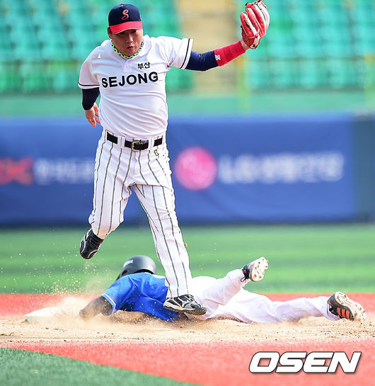 23일 전라북도 군산시 사정동 월명야구장에서 열린 제1회 KBO총재배 시도대항 전국 직장인 야구대회 4강전 부산 세종공업과 경남 삼성테크윈 경기, 4회말 1사 주자 1루 삼성테크윈 김성구 타석에서 1루 주자 김영수가 2루 도루에 성공하고 있다.