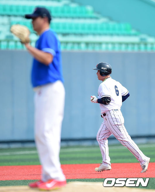 23일 전라북도 군산시 사정동 월명야구장에서 열린 제1회 KBO총재배 시도대항 전국 직장인 야구대회 4강전 부산 세종공업과 경남 삼성테크윈 경기, 5회초 1사 주자 1,3루 세종공업 김태균이 스리런 홈런을 날린 후 그라운드를 돌고 있다.