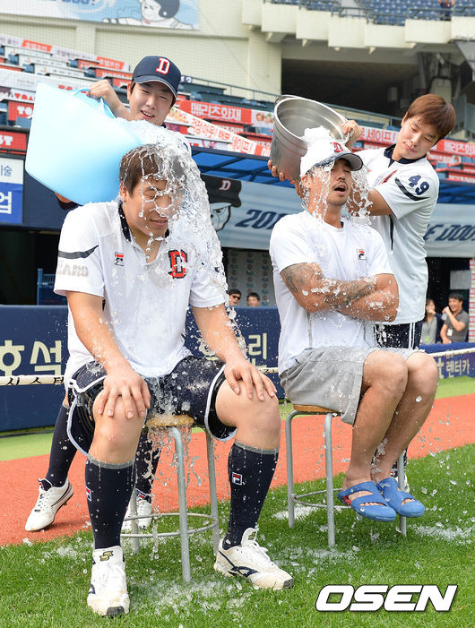 경기에 앞서 두산 김현수와 오재원이 아이스버킷챌린지를 하고 있다.