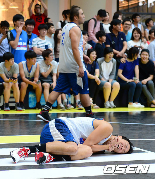 23일 오후 서울 영등포 타임스퀘어 아트리움에서 열린 아디다스 '크레이지코트 2014' 개그콘서트 vs 웃찾사의 경기, 전반전 개콘 오지헌이 코트 위에 쓰러져 장난을 치고 있다.