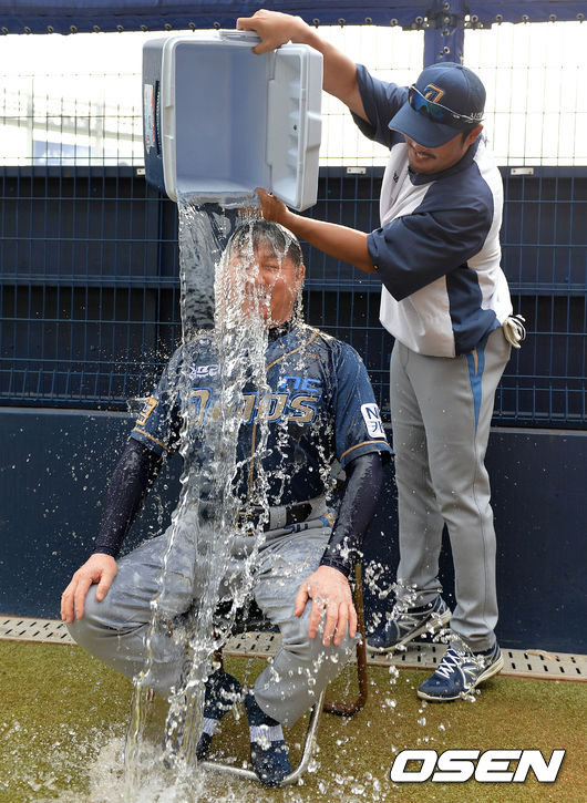 경기에 앞서 NC 김경문 감독이 아이스버킷챌린지를 하고 있다.
