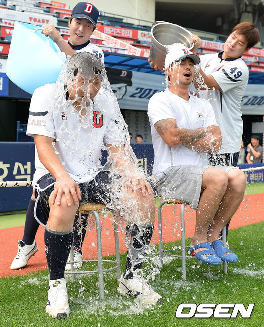 경기에 앞서 두산 김현수와 오재원이 아이스버킷챌린지를 하고 있다.