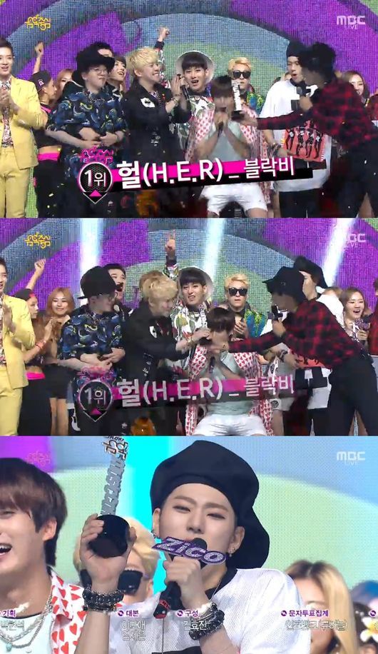 블락비는 23일 오후 방송된 MBC 음악프로그램 '음악중심'에서 ‘헐(Her)'로 씨스타, 위너를 꺾고 1위를 차지했다. 이들은 1위 수상 후 소속사와 팬들에게 감사 인사를 했다.