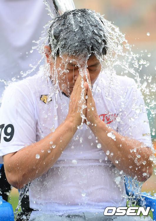 23일 오후 부산 사직구장에서 열린 '2014 한국야쿠르트 세븐 프로야구' 롯데 자이언츠와 LG 트윈스의 경기 시작전 양상문 감독이 아이스버킷챌린지에 동참하며 얼음물을 뒤집어 쓰고 있다.