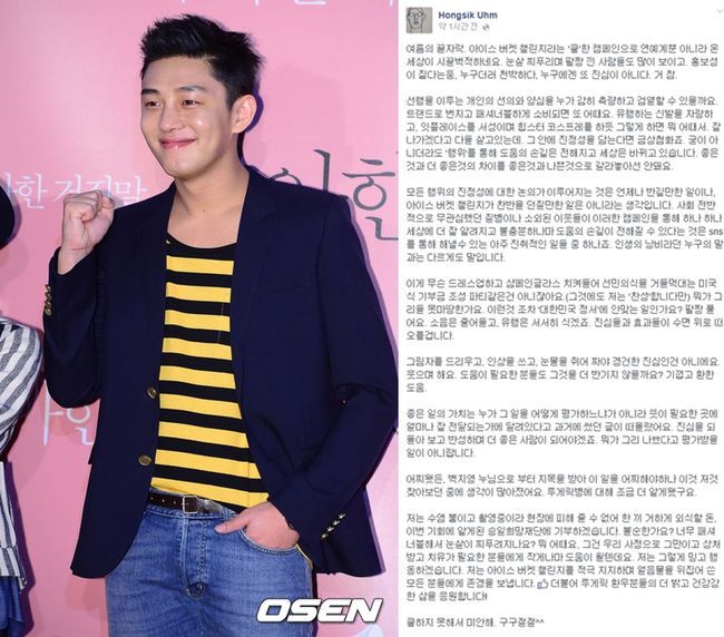 유아인은 23일 오후 자신의 페이스북을 통해 ‘아이스 버킷 챌린지’에 대한 장문의 글을 게재했다. 최근 홍보성과 왜곡된 진심에 대한 여론에 대해 언급한 것이다.