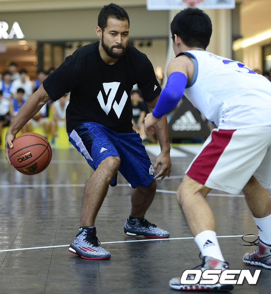 23일 오후 서울 영등포 타임스퀘어 아트리움에서 열린 아디다스 '크레이지코트 2014'에 참석한 농구선수 전태풍이 행사 참가자와 일대일 승부를 펼치고 있다.