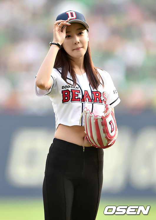 경기에 앞서 걸그룹 레인보우 우리가 시구를 하고 있다.