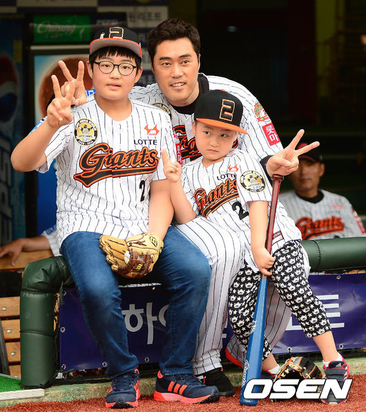 23일 오후 부산 사직구장에서 열린 '2014 한국야쿠르트 세븐 프로야구' 롯데 자이언츠와 LG 트윈스의 경기 시작전 조성환이 두 아들과 함께 덕아웃에서 포즈를 취하고 있다.