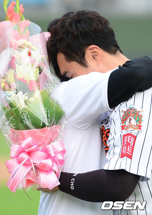 23일 오후 부산 사직구장에서 열린 '2014 한국야쿠르트 세븐 프로야구' 롯데 자이언츠와 LG 트윈스의 경기 시작전 조성환이 양상문 감독의 꽃다발을 받고 포옹을 하고 있다. 조성환은 이날 은퇴식을 갖는다.