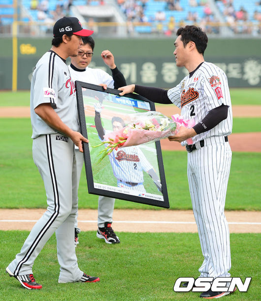 23일 오후 부산 사직구장에서 열린 '2014 한국야쿠르트 세븐 프로야구' 롯데 자이언츠와 LG 트윈스의 경기 시작전 조성환이 이병규로부터 대형 사진을 건내받고 있다.