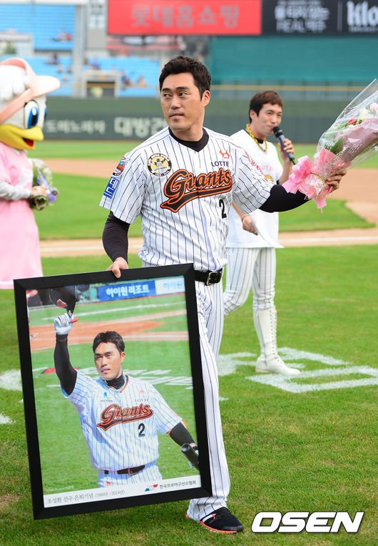23일 오후 부산 사직구장에서 열린 '2014 한국야쿠르트 세븐 프로야구' 롯데 자이언츠와 LG 트윈스의 경기 시작전 조성환이 동료들로부터 꽃다발, 기념액자를 받은 후 덕아웃으로 향하고 있다.
