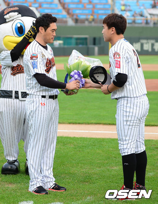 23일 오후 부산 사직구장에서 열린 '2014 한국야쿠르트 세븐 프로야구' 롯데 자이언츠와 LG 트윈스의 경기 시작전 조성환이 박준서로부터 꽃다발을 받고 있다.