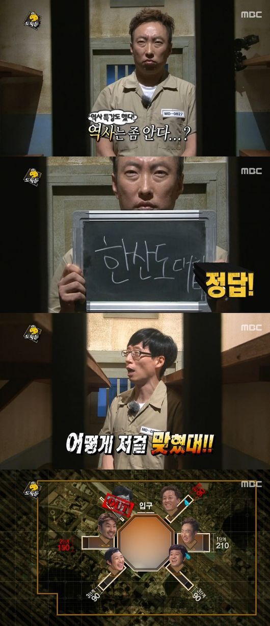 유재석은 23일 방송된 MBC 예능프로그램 ‘무한도전’이 벌인 심리전에서 박명수가 이순신 장군의 한산도대첩을 맞추면서 그만 탈락하고 말았다. 유재석은 박명수가 임진왜란 3대 대첩을 틀릴 것이라고 예상했지만 예상은 빗나갔다.