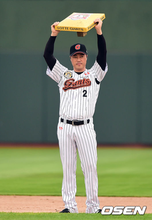 23일 오후 부산 사직구장에서 열린 '2014 한국야쿠르트 세븐 프로야구' 롯데 자이언츠와 LG 트윈스의 경기 시작전 조성환이 2루에서 시수비를 한 후 기념 베이스를 들고 미소를 짓고 있다.