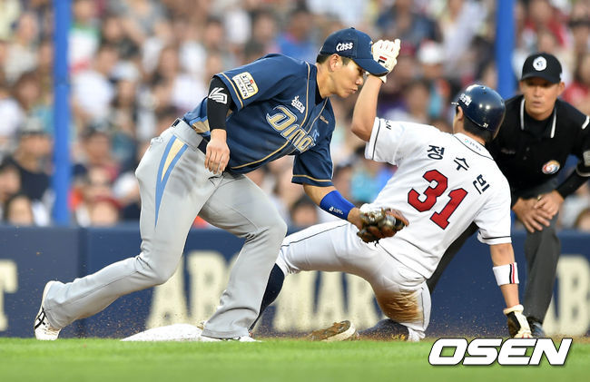 2회말 2사 2루에서 두산 2루주자 정수빈이 도루에 성공하고 있다.