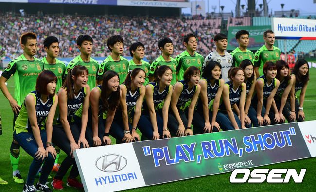 23일 오후 전주월드컵경기장에서 열린 전북 현대와 FC 서울의 '현대오일뱅크 K리그 클래식 2014' 22라운드 경기, 경기 전 전북 현대 선수들이 현대건설 힐스테이트 여자 배구단과 함께 포토타임을 갖고 있다.