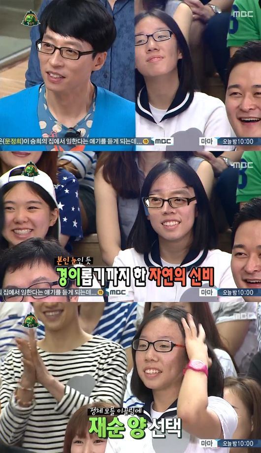 멤버들은 유재석 닮은꼴 여중생에게 “재순아”를 외치며 웃음을 터뜨렸다. 이들은 “눈이 닮았다”며 관심을 보였고 유재석은 자신의 팬일 것이라고 예상했다. 결과는 정답이었다. 유재석은 “재순아”라고 외치며 미소를 지었다.