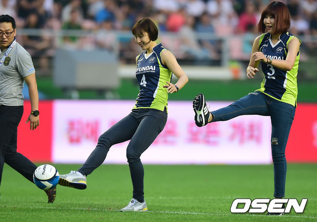 23일 오후 전주월드컵경기장에서 열린 전북 현대와 FC 서울의 '현대오일뱅크 K리그 클래식 2014' 22라운드 경기, 현대건설 힐스테이트 여자 배구단의 황연주(왼쪽) 염혜선(오른쪽)이 시축을 하고 있다.