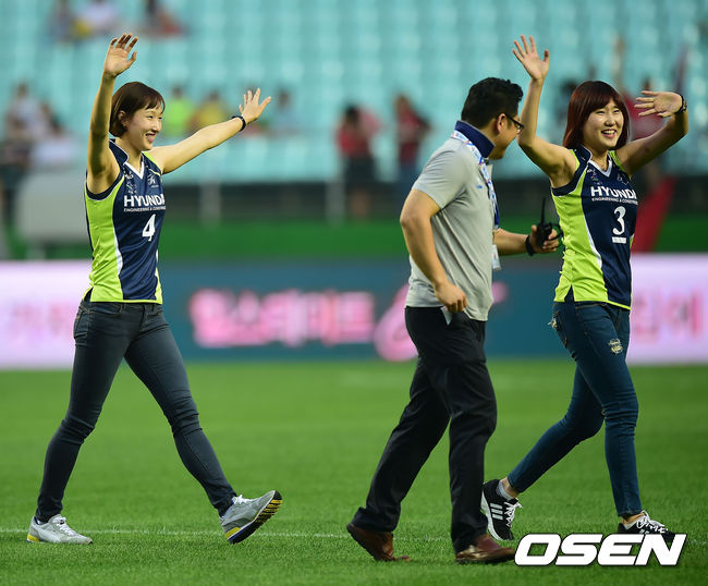 23일 오후 전주월드컵경기장에서 열린 전북 현대와 FC 서울의 '현대오일뱅크 K리그 클래식 2014' 22라운드 경기, 현대건설 힐스테이트 여자 배구단의 황연주(왼쪽) 염혜선(오른쪽)이 시축을 한 후 손을 흔들고 있다.