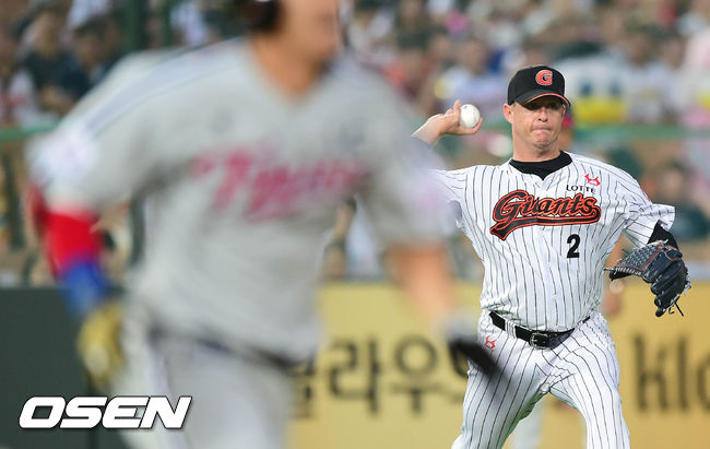 23일 오후 부산 사직구장에서 열린 '2014 한국야쿠르트 세븐 프로야구' 롯데 자이언츠와 LG 트윈스의 경기 4회초 선두타자 이병규의 땅볼을 잡은 옥스프링이 1루로 송구 하고 있다.