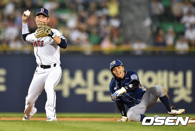 4회초 1사 1룰에서 두산 고영민이 NC 지석훈을 병살타로 처리하고 있다.