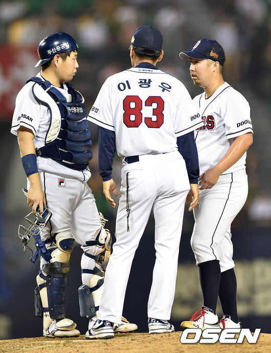 5회초 1사 2루 NC 나성범 타석때 마운드를 방문한 두산 이광우 코치가 유희관과 이야기를 나누고 있다.