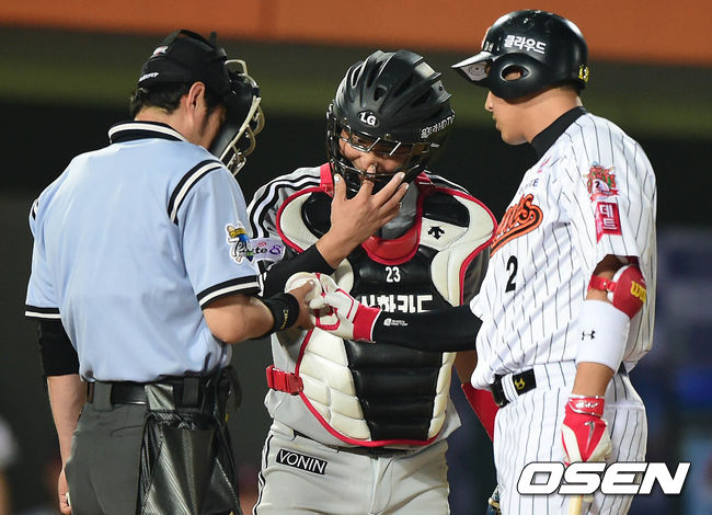 23일 오후 부산 사직구장에서 열린 '2014 한국야쿠르트 세븐 프로야구' 롯데 자이언츠와 LG 트윈스의 경기 7회말 2사 주심이 황재균의 타구의 파울 여부를 확인하기 위해 공을 살펴보고 있다.