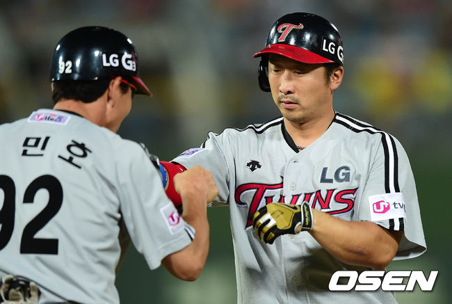 23일 오후 부산 사직구장에서 열린 '2014 한국야쿠르트 세븐 프로야구' 롯데 자이언츠와 LG 트윈스의 경기 8회초 1사 1,2루 이병규가 1타점 적시타를 치고 김민호 코치와 하이파이브를 하고 있다.