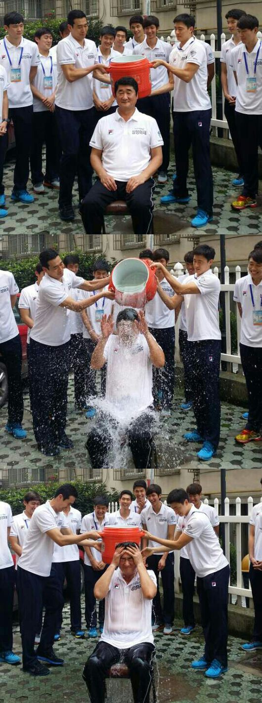 23일 중국 상하이에서 전지훈련 중인 신치용 감독은 선수들이 지켜보는 가운데 "이렇게 의미있는 활동에 참여하게 돼 기쁘다. 귀국하는대로 루게릭병 협회에 기부하겠다"면서 얼음물을 시원하게 맞는 모습을 보여줬다.(동영상 주소 : https://facebook.com/bluefangs)