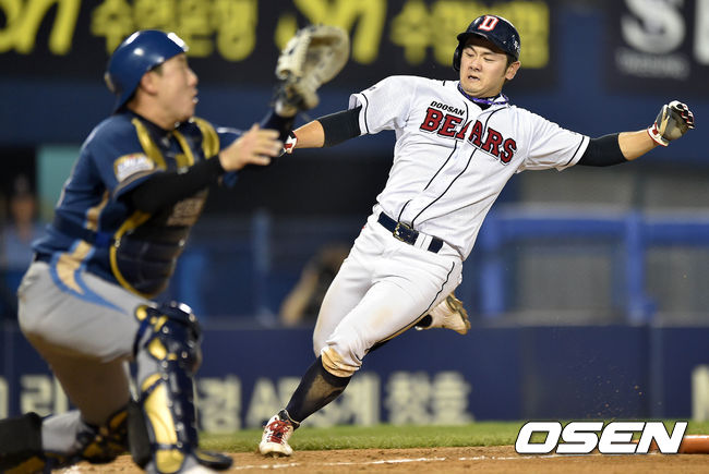 7회말 1사 1,3루에서 두산 홍성흔의 희생플라이때 3루주자 최주환이 태그업을 시도, 홈에서 세이프되고 있다.
