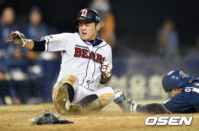 7회말 1사 1,3루에서 두산 홍성흔의 희생플라이때 3루주자 최주환이 태그업을 시도, 홈에서 세이프되고 있다.