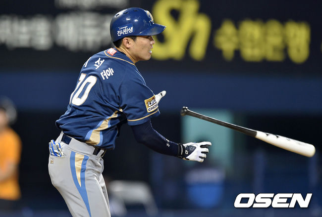 8회초 무사 1,2루에서 NC 지석훈이 중전 적시타를 치고 있다.