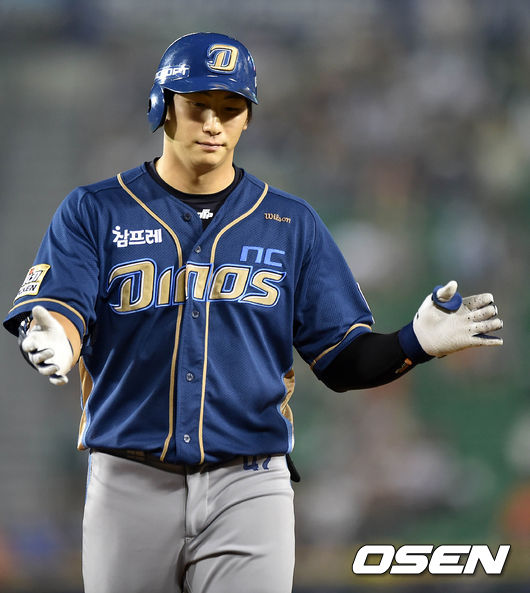 8회초 1사 만루에서 NC 나성범이 중전 2타점 적시타를 치고 환호하고 있다.