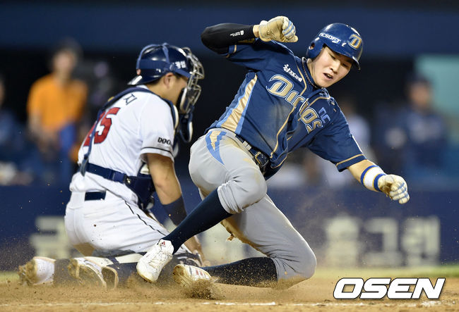 8회초 1사 1,2루에서 NC 테임즈의 좌전 적시타때 2루주자 박민우가 홈에서 세이프 되고 있다.