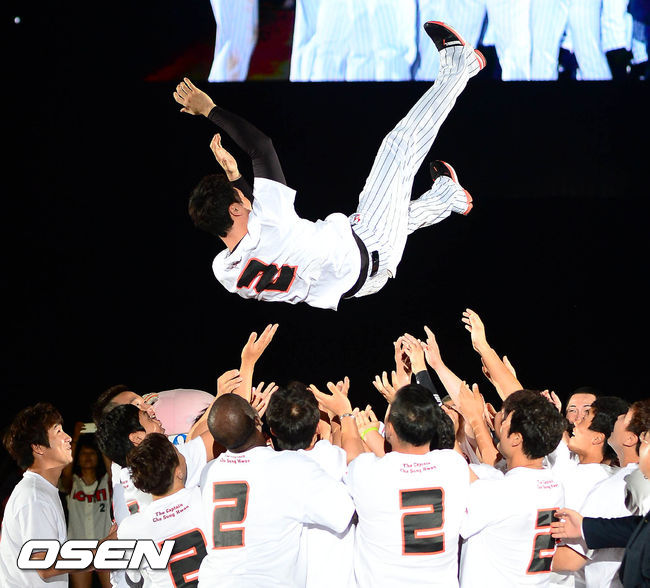 23일 오후 부산 사직구장에서 열린 '2014 한국야쿠르트 세븐 프로야구' 롯데 자이언츠와 LG 트윈스의 경기 종료후 조성환이 은퇴식에서 헹가래를 받고 있다.