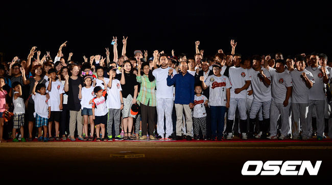 23일 오후 부산 사직구장에서 열린 '2014 한국야쿠르트 세븐 프로야구' 롯데 자이언츠와 LG 트윈스의 경기 종료후 조성환이 은퇴식에서 가족을 비롯한 동료 선수들, 팬들과 기념촬영을 하고 있다.