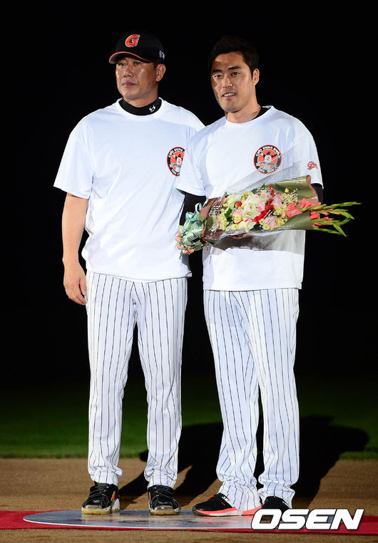 23일 오후 부산 사직구장에서 열린 '2014 한국야쿠르트 세븐 프로야구' 롯데 자이언츠와 LG 트윈스의 경기 종료후 조성환이 은퇴식에서 김시진 감독과 하이파이브를 하고 있다.