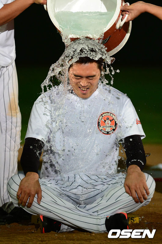 23일 오후 부산 사직구장에서 열린 '2014 한국야쿠르트 세븐 프로야구' 롯데 자이언츠와 LG 트윈스의 경기 종료후 조성환이 은퇴식에서 아이스버킷챌린지에 동참하고 있다.