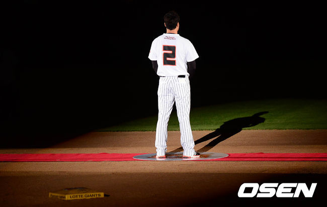 23일 오후 부산 사직구장에서 열린 '2014 한국야쿠르트 세븐 프로야구' 롯데 자이언츠와 LG 트윈스의 경기 종료후 조성환이 은퇴식에서 전광판에 나오는 영상을 바라보고 있다.