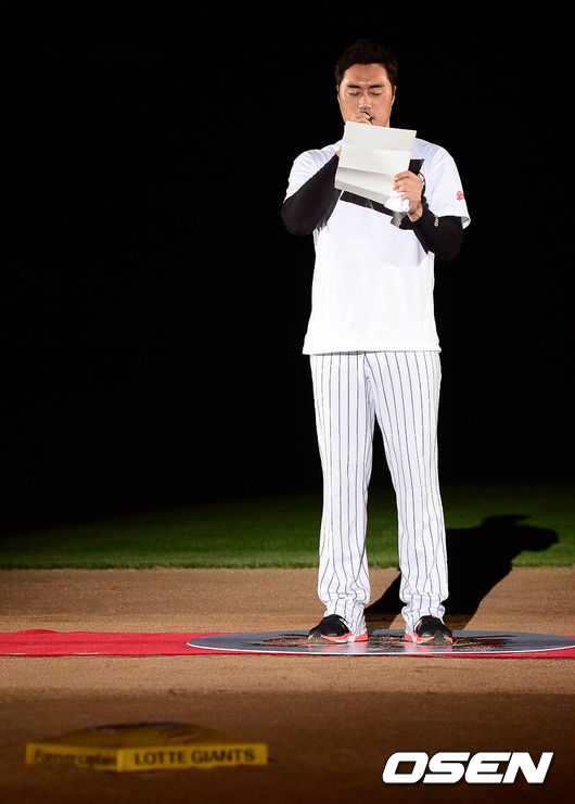 23일 오후 부산 사직구장에서 열린 '2014 한국야쿠르트 세븐 프로야구' 롯데 자이언츠와 LG 트윈스의 경기 종료후 조성환이 은퇴식에서 자신이 쓴 편지를 읽고 있다.