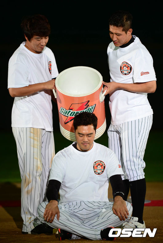23일 오후 부산 사직구장에서 열린 '2014 한국야쿠르트 세븐 프로야구' 롯데 자이언츠와 LG 트윈스의 경기 종료후 조성환이 은퇴식에서 아이스버킷챌린지에 동참하고 있다.