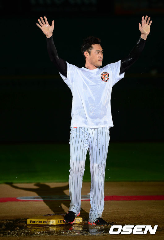 23일 오후 부산 사직구장에서 열린 '2014 한국야쿠르트 세븐 프로야구' 롯데 자이언츠와 LG 트윈스의 경기 종료후 조성환이 은퇴식에서 팬들에게 손을 흔들고 있다.