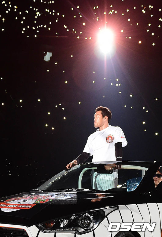 23일 오후 부산 사직구장에서 열린 '2014 한국야쿠르트 세븐 프로야구' 롯데 자이언츠와 LG 트윈스의 경기 종료후 조성환이 은퇴식에서 카퍼레이드를 하고 있다.