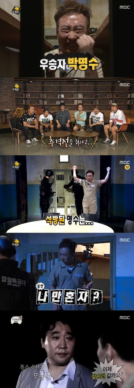 지난 23일 방송된 MBC 예능프로그램 ‘무한도전’은 심리전 특집인 ‘도둑들’ 결과 박명수가 최종 우승을 하며 석방되는 이야기가 그려졌다. 박명수는 박터지는 심리전에서 끝까지 살아남았다. 노홍철과 하하 등을 제치고 석방의 행운을 거머쥐었다. 그런데 여기서 끝이 아니었다. 끝날 때까지 끝나는 게 아니라는 말이다.