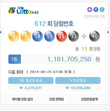 5개 번호와 보너스번호 40을 맞춘 2등은 3671만 9655만 원씩을 받는다. 3등은 118만 1921원을 받는다. 4등은 5만원, 5등은 5천원을 수령 받는다.