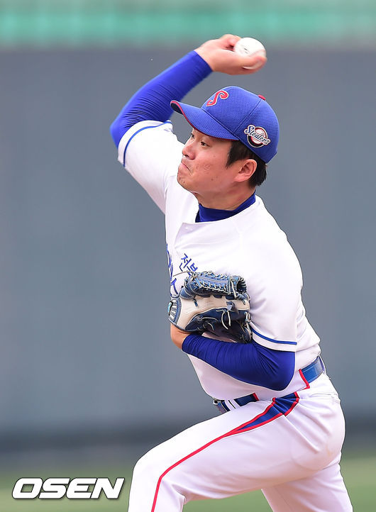24일 전라북도 군산시 사정동 월명야구장에서 열린 제1회 KBO총재배 시도대항 전국 직장인 야구대회 결승전 부산 세종공업과 전북 세아베스틸의 경기, 세아베스틸 선발 박성현이 힘차게 공을 뿌리고 있다.