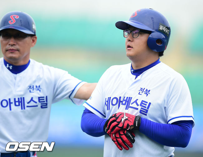24일 전라북도 군산시 사정동 월명야구장에서 열린 제1회 KBO총재배 시도대항 전국 직장인 야구대회 결승전 부산 세종공업과 전북 세아베스틸의 경기, 1회말 1사 주자 3루 세아베스틸 조광현이 투수 앞 땅볼 타구로 선취 1타점을 올린 후 덕아웃으로 향하고 있다.